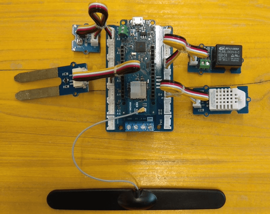 The moisture sensor will be later fitted in the soil, and the relay connected to a proper power supply and to a valve or a water pump.