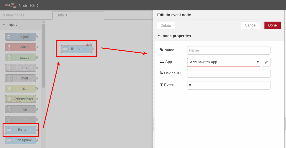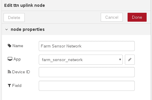 Now set a name for this node. Let the Device ID and the Field fields empty (in this way this node will receive the uplinks from all the devices registered in that app!) and press Done.
