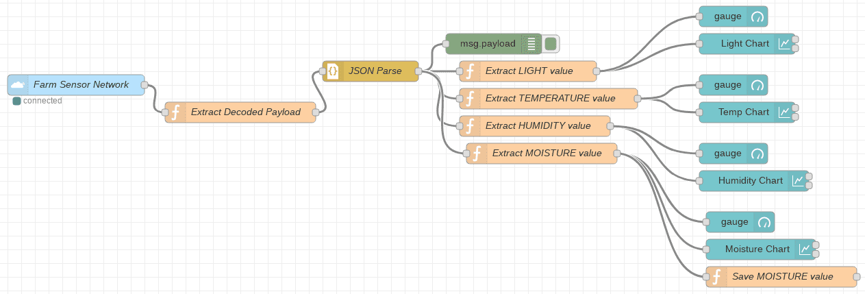 - In the same way we process that JSON in order to extract the light, temperature, humidity and moisture values thanks to other few function nodes