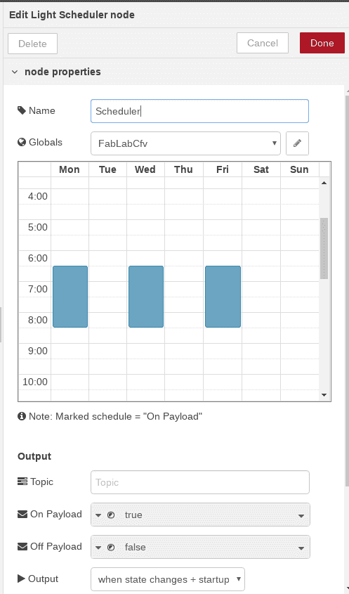 Editing this node (double click on it, once dragged into the flow) allows us to define a weekly scheduling, to set Latitude and Longitude of our "farm" in order to calculate sunshine / sunrise (in the Globals field), and to set the output method: here set