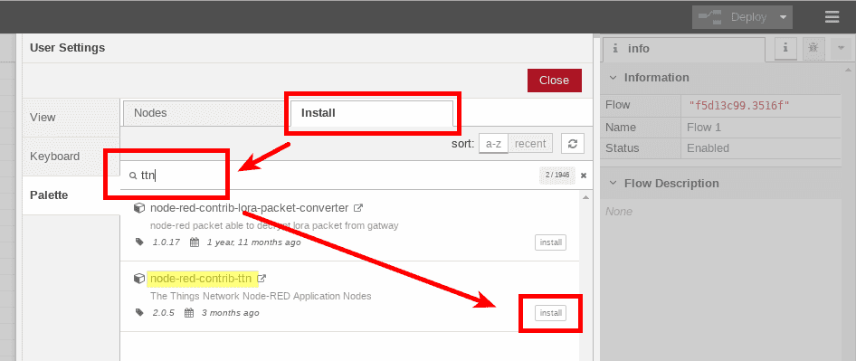 Clink on the install button and then fill the search field with "ttn"; it will filter the available palettes. Let's install the node-red-contrib-ttn one by pressing the install button in the filtered result.