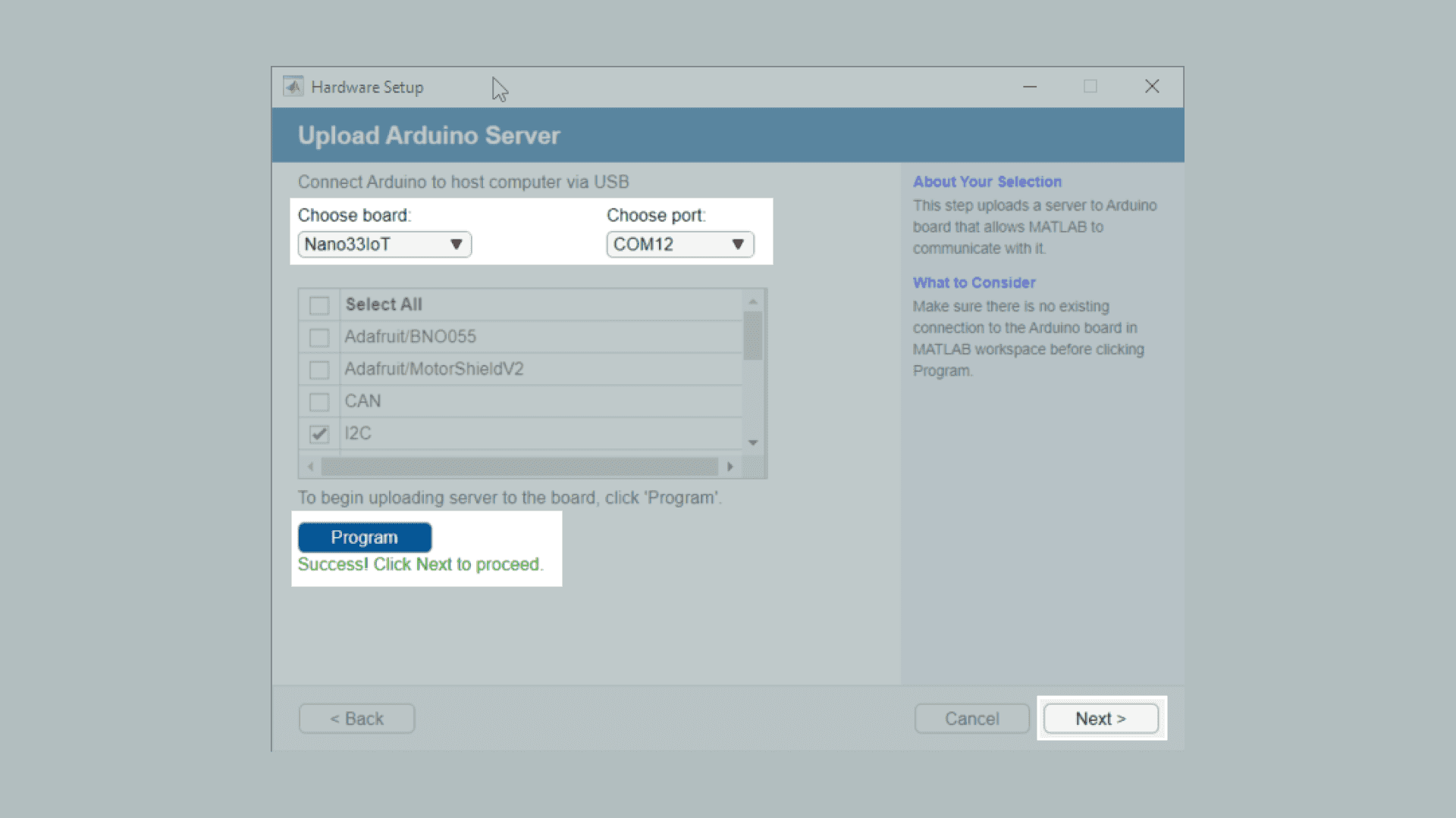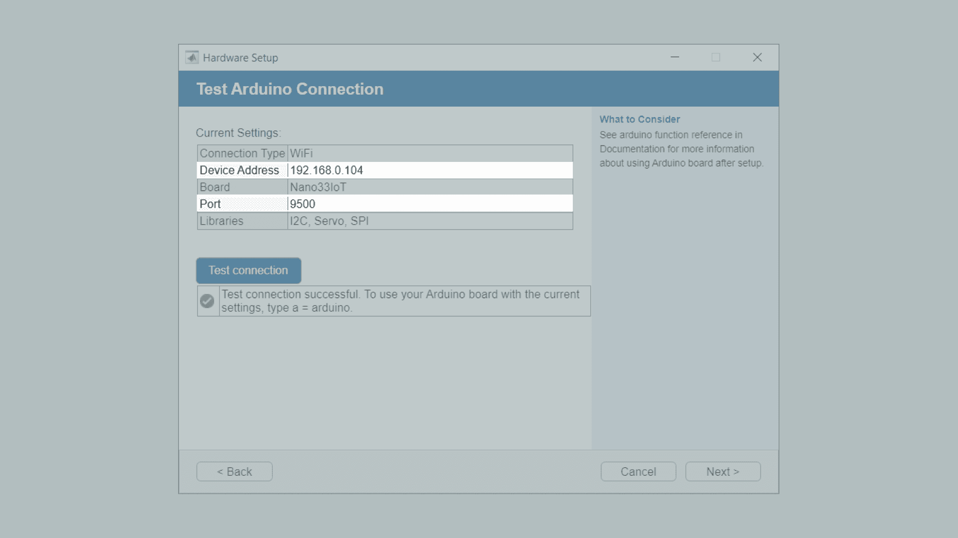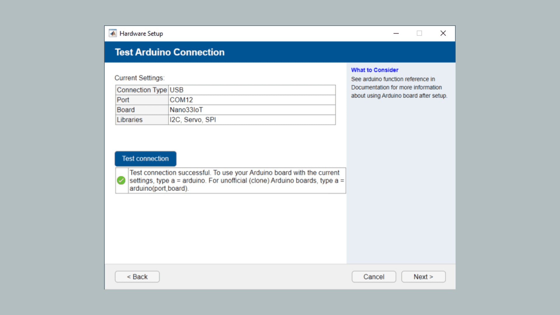 7. In this step you can review the connection type, Port, board and loaded libraries. You can also click on Test connection to evaluate the Arduino-MATLAB connection. Next, you should see a Green check-mark signalling the successful connection, as shown in the image below.