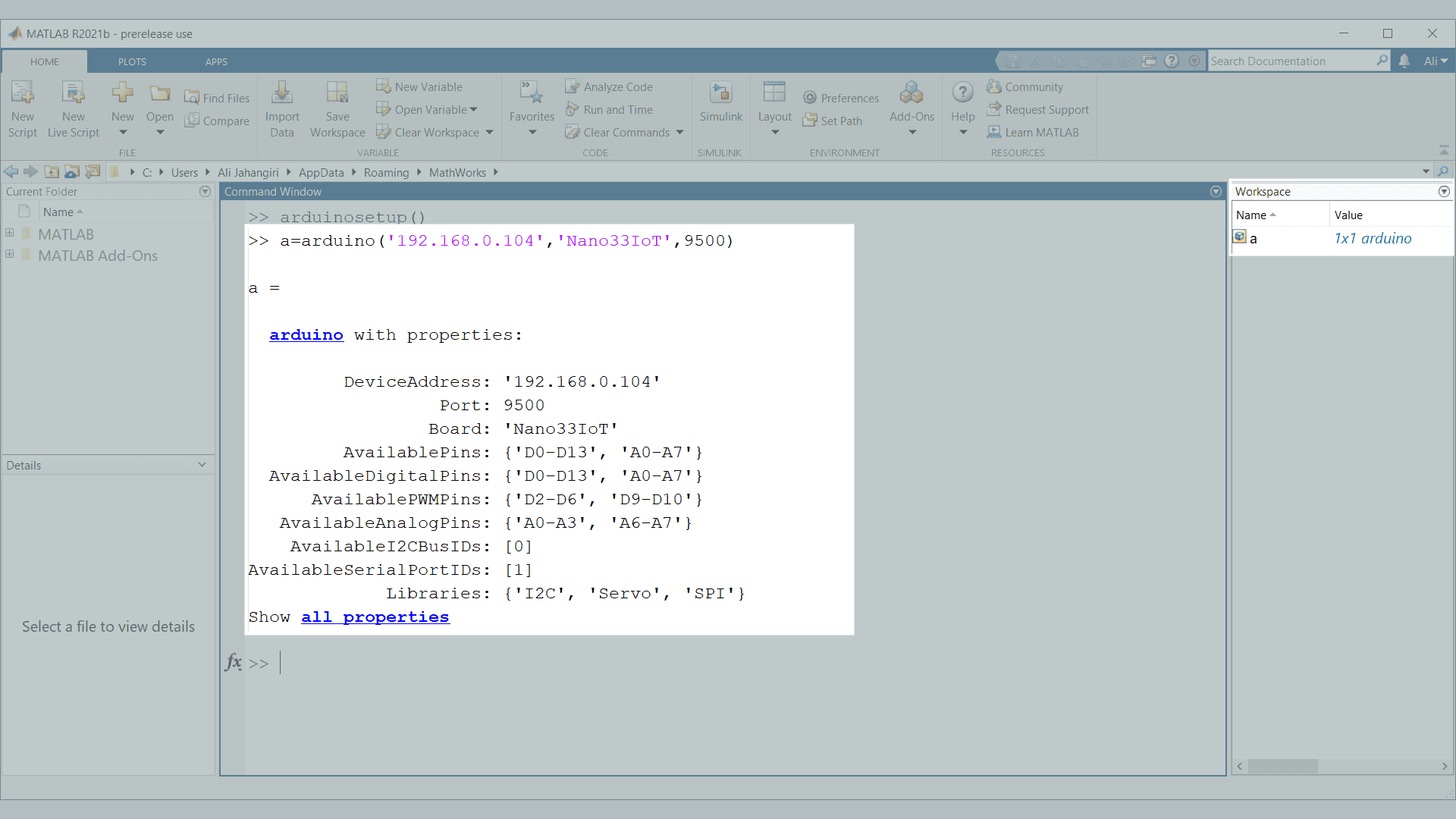 8. The Arduino Nano 33 IoT is now configured to interact with MATLAB. Now to create the object in MATLAB, we run the command