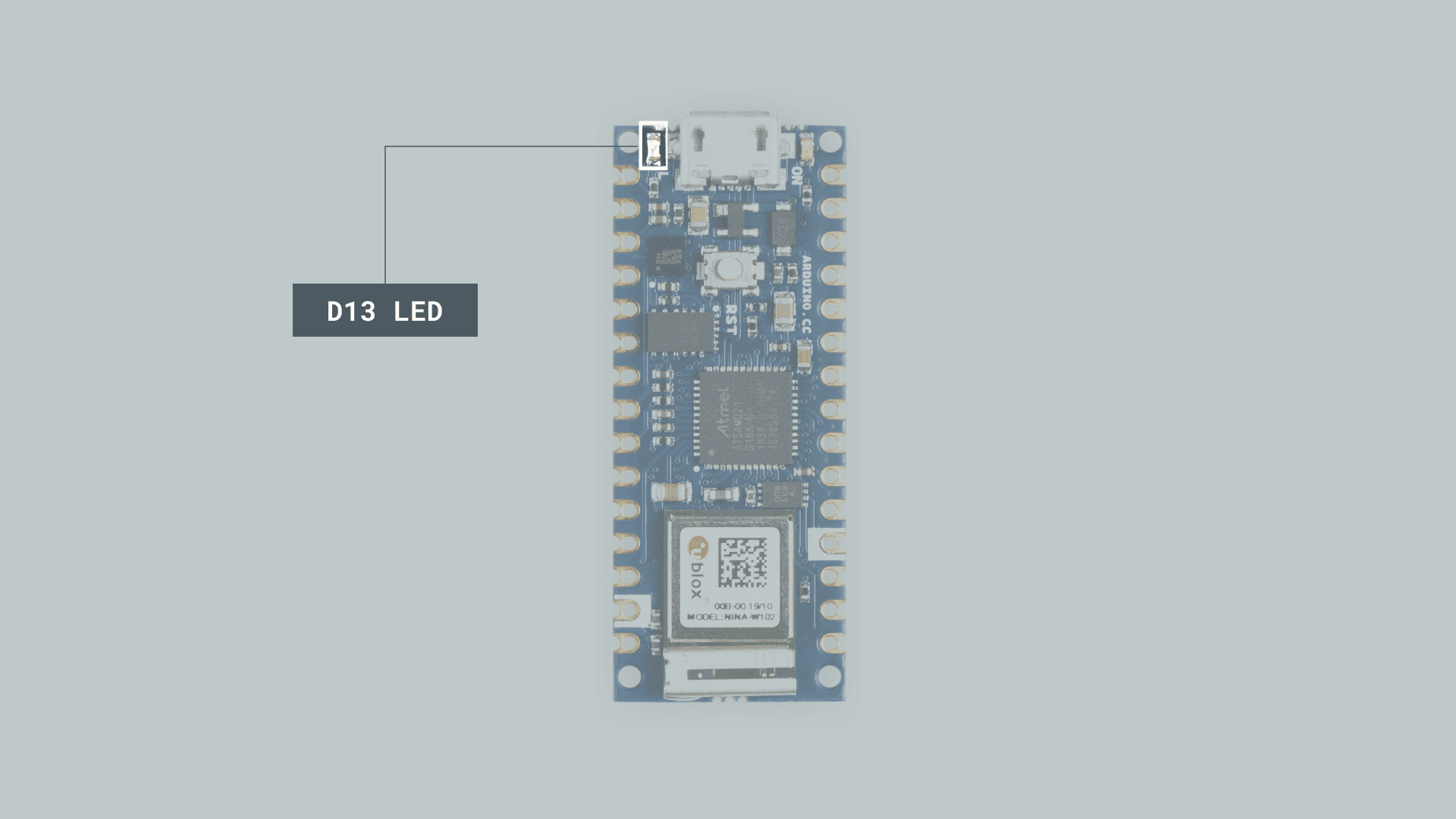 The LED in the Arduino Nano 33 IoT is connected to Digital Pin 13. By pulling this pin HIGH, we can turn the LED on and by pulling it LOW we can turn the LED off.
