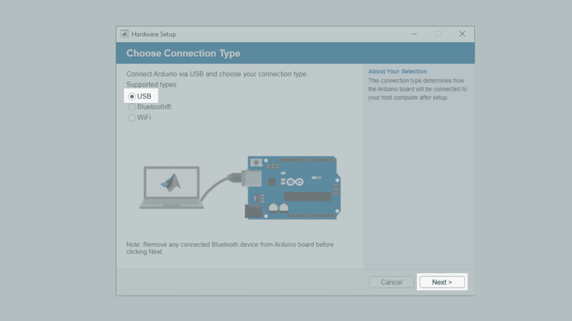 5. A Graphical User Interface (GUI) appears, that will help you set up the MATLAB-Arduino connection. To establish the connection over the USB cable, make sure that the USB radio box is selected and then click on Next.